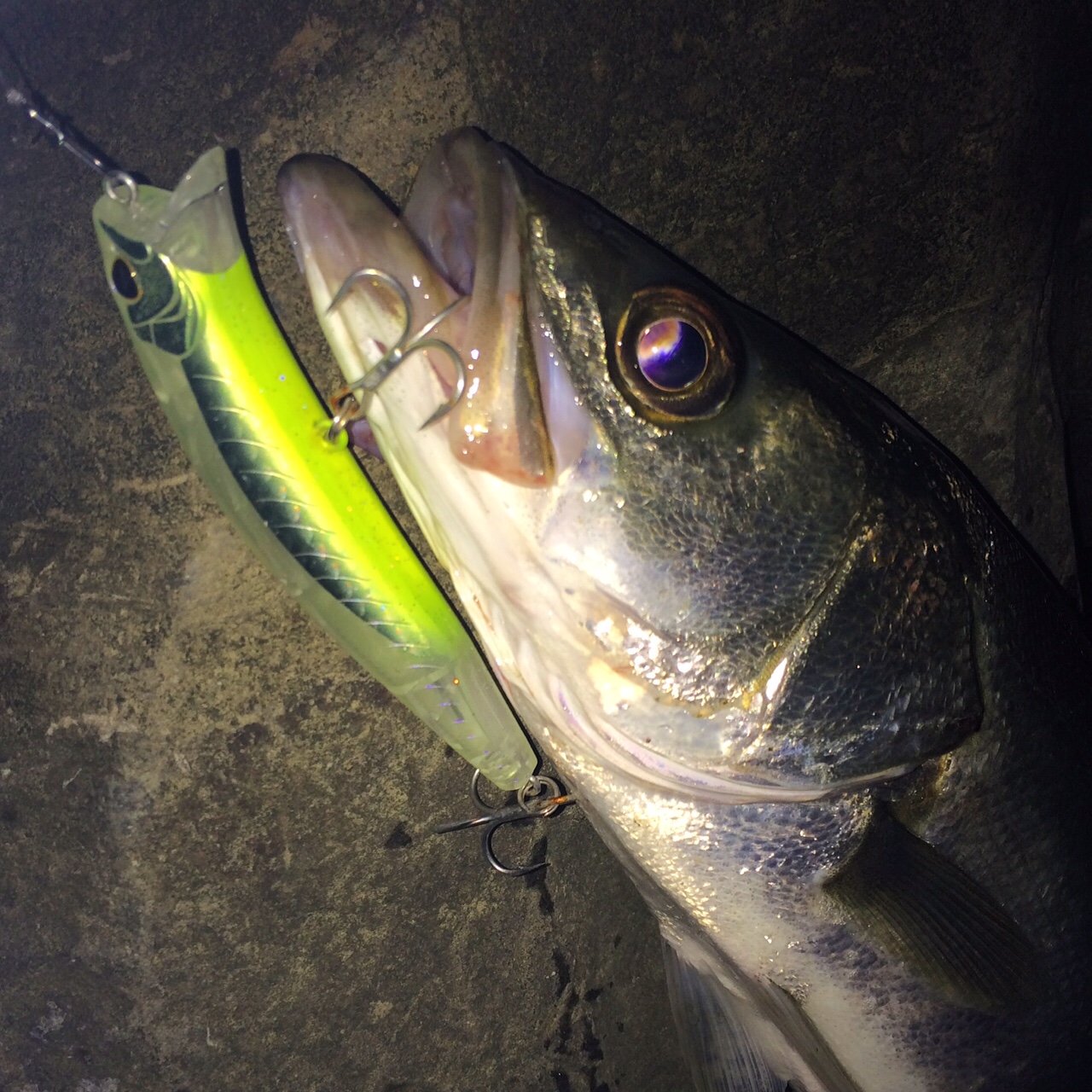 って肝心の釣果はというと…。前半に行った桟橋に停まっていた船にギリギリに沿ってルアーを通し、船尾の角を通る瞬間に下からギラって出て来た極太のシーバスが…。
